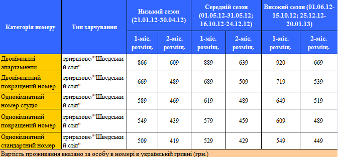 Розміщення додаткового місця для дітей 4-18 років - від 315,5 до 332,5 грн.